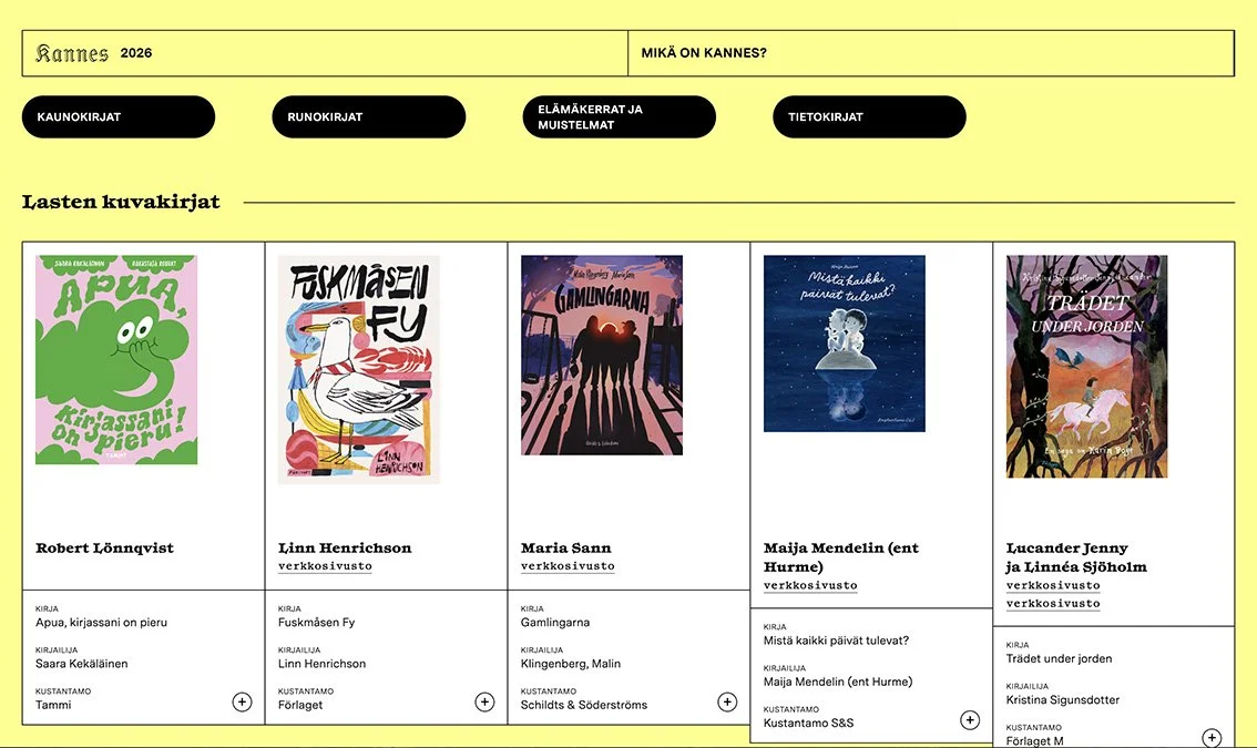 The finalists for The most beautiful book of 2024 have been selected. This year I’m so lucky to have two of my books in the selection - Fjärilarnas rekordbok (text by Katja Bargum) and Yön äänet (poems by Kirsi Kunnas).
