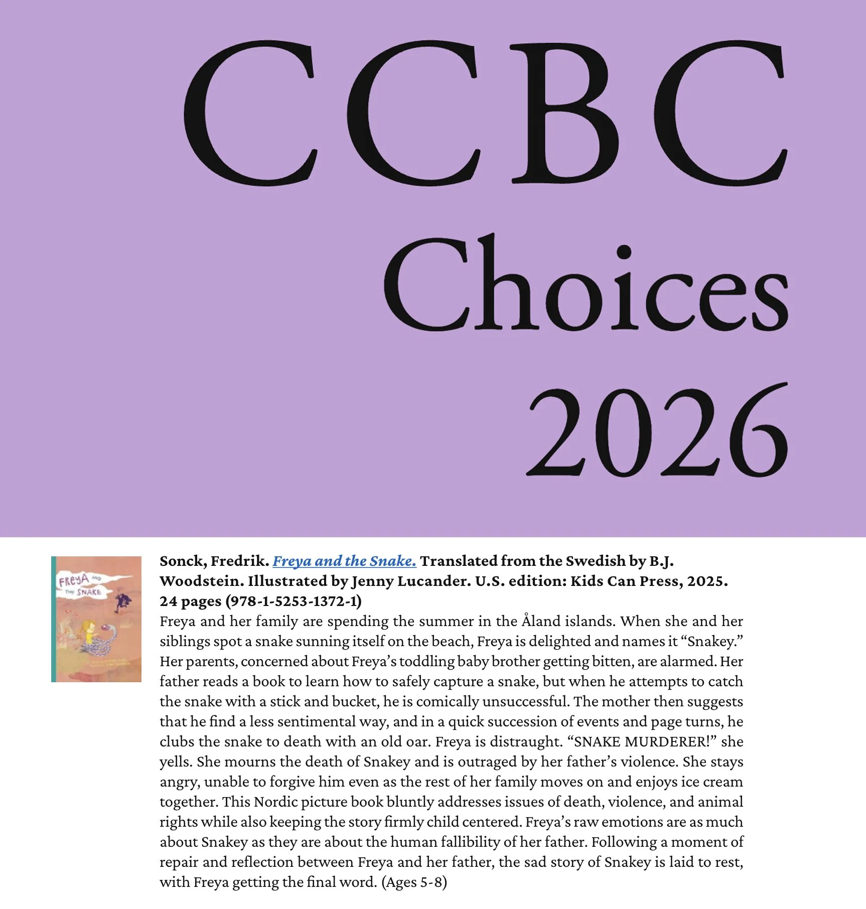 Det är ett stort steg att sluta med napp. ”Freja och kråkungen” av Fredrik Sonck och Jenny Lucander utspelar sig under en loj sommardag vid havet. Det är en varm familjeskildring om att släppa taget. Inte för andras skull, men för sin egen. Allt laddat med lika delar humor som allvar, skriver Dagens Nyheter! www.forlaget.com/bocker/freja-och-krakungen/